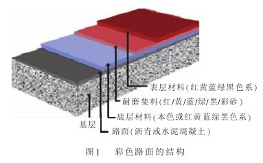 路面的彩色防滑处理技术主要是指通过采用高性能的双组分丙烯酸树脂,将混合选定的高耐磨值的防滑骨料铺设于道路表面,使之与基材完好地结合在一起,在保证极佳的附着力、高耐磨强度的前提下,大大提高了路面的防滑值(SRT60以上),最终减少因道路表面光滑而造成的事故,并缩短刹车距离。彩色防滑路面的结构见图1。