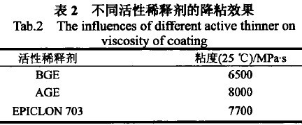常用的活性稀释剂主要有AGE、BGE,它们均为低分子质量环氧化合物,较易挥发、气味浓、毒性较大,不符合日益增长的环保要求。EPICLON 703为C12.C14烷基缩水甘油醚,沸点高达107℃,不易挥发,极低的气味,毒性低,具有优异的颜填料润湿能力,是一种环保型环氧活性稀释剂。不同的活性稀释剂对漆料的降粘效果不一样。保持其它条件不变,分别采用BGE、AGE和EPIcLON 703制漆,测定它们的粘度,以观察不同活性稀释剂的降粘效果。粘度测试结果见表2。