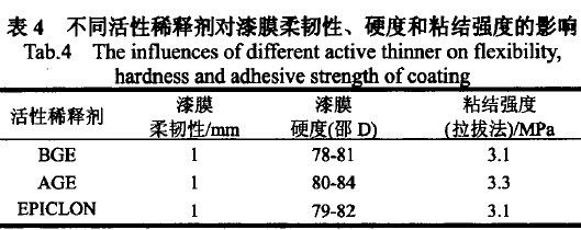 2.6不同活性稀释剂对漆膜柔韧性、硬度和粘结强度的影响通过上述树脂、固化剂、助剂和颜填料的选择,我们得出了优化后的无溶剂环氧自流平地坪涂料配方。以此配方为基础,保持其它条件不变,仅改变活性稀释剂的种类,分别以BGE、AGE、EPICLON 703为活性稀释剂制备了三个色漆(A组分),然后,采用NX.2009作为固化剂(B组分)分别制备涂膜,并测定它们的柔韧性、表面硬度以及与水泥基面的粘结强度,测试结果见表4。