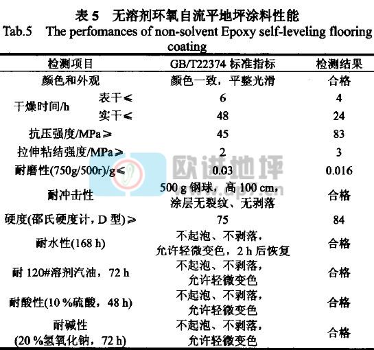 按照优化后的配方,采用环保型活性稀释剂EPICLON 703制备无溶剂环氧自流平地坪涂料,并按国标方法检测其各项性能,多次重复试验的测试结果重现性好,所制备涂料的各项性能达到或高于国标规定的指标,检测结果见表5。