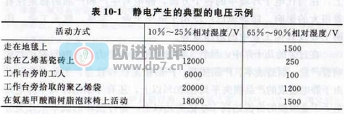 已知“摩擦带电”是由于物体接触和分开产生的静电荷,这就涉及物体之间电子的转移。当两物体接触然后分开时,如果电子从一个物体表面向另一个物体表面转移,物体失去电子和得到电子完全取决于两物质的特性。失去电子的物体带有正电,而获得电子的物体就带有负电。物体接触、电子转移和分开的过程是比较复杂的。摩擦产生的电荷数量受接触范围、分开速率、相关湿度和其他因素影响。一且物体产生了电荷,就具有了“静电”电荷(如果它滞留在物体上)。该电荷在物体上进行转移,就产生了静电放电现象。如实际放电电路电阻和接触电阻等附加因素在接触表面之间的界面上也影响实际放电,而此类放电就会引起损坏。静电产生的典型的电压示例见表
