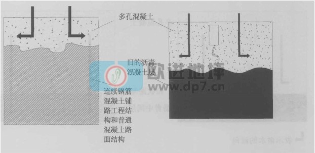 这种路面(右上图)属于排水型路面结构,结构的承载能力由下层的沥青混凝土层和上层5cm--10cm的多孔混凝土层为一体的结构来承载。这种路面结构可以作为铺筑新的混凝土结构层,也可以用做旧的混凝土路面的修缮工程。