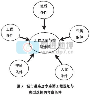 欧美等国家城市道路透水性路面设计主要包括5步:工程选址与评估一透水铺装材料选用与评估一透水路面结构设计分析一透水路面施工与质量控制一透水路面成效评估.其中,工程选址与评估为首要步骤,与透水路面选型密切相关,两者共同决定透水路面工程的可行性、适用性、实用性、经济性;但具体操作方法不尽相同,美国偏重试验法,日本采用试验一经验法,我国台湾则采用人文、水文、地文调查法,综合上述各方法优点,结合我国实际,本研究认为我国在进行城市道路透水路面建设工程选址与类型选择时,可在常规工程选址调查的基础上,综合考察图所示的地质、气候、人文,交通、工程等5方面条件,做出合理决策。