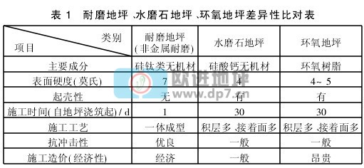 工业彩色耐磨地坪的施工采用机械化施工,并且施工时要和基层混凝土浇筑同步进行,与其他地坪相比,可大幅度缩短工期,避免了水磨石地坪施工时出现的泥浆、污水污染现象,且具有耐磨性好,不起尘;硬度高,可重载;表面致密防渗透;成本低的特点。