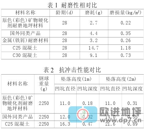 表1、表2列出了彩色耐磨地坪材料与金属(铁屑)耐磨材料、国外同类产品以及C25、C30混凝土的耐磨性能和抗冲击性能对比结果。