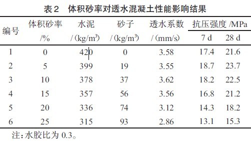 由表2 中可知,体积砂率在0~15%范围内透水系数变化较小,当体积砂率超过15%时,透水系数明显下降。这主要是因为,在配合比设计中,砂子等体积取代水泥,透水混凝土的孔隙率保持不变,因此其透水系数随着体积砂率的变化较小;但体积砂率超过一定值后,由于骨料的级配得到改善且砂子堵塞透水混凝土孔隙的几率增大,从而导致透水系数下降。