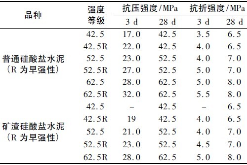 表1 普通硅酸盐水泥和矿渣硅酸盐水泥的强度要求( GB175 - 99,GB1344 - 92)Table 1 The strength requirement of ordinary portlandcement and slag silicate cement ( GB175 - 99,GB1344 - 92)