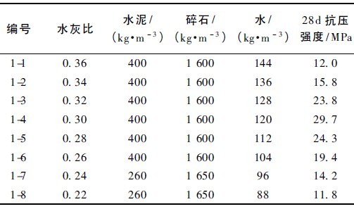试验共做8 组试块,骨料级配为80% 粒径10 ~24mm 碎石和20% 粒径5 ~ 10mm 碎石,不加外加剂。试验结果如表1 所示。