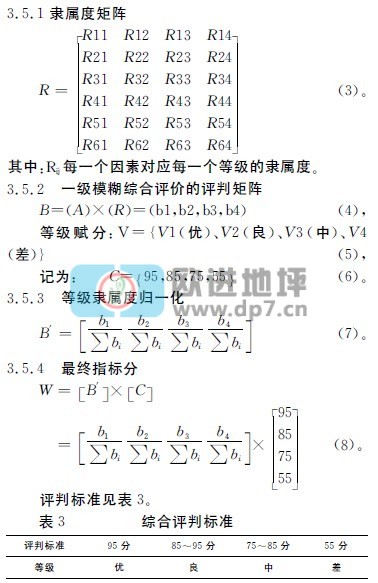 根据前面建立的道路综合效益模糊综合评价体系,对该透水混凝土地面的综合效益进行评判。该评价体系中的权重赋值主要根据上海市城管学院园林与环境学院的教师打分确定的,采用问卷的形式对上海市普通市民进行问卷调查,进行统计确定隶属度值,评价结果如下。